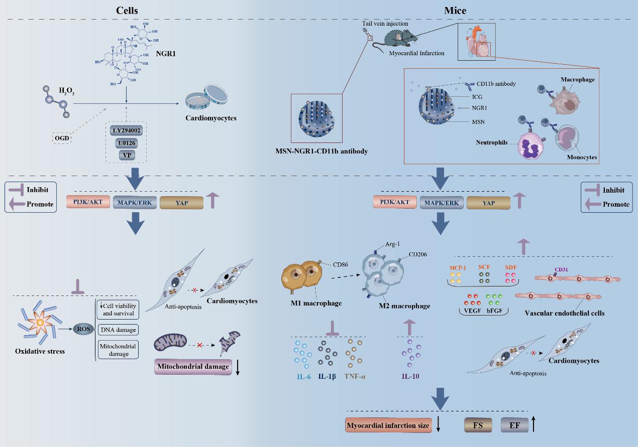 MSN-NGR1-CD11b抗体纳米粒能有效的改善心功能,减少心肌细胞凋亡,诱导巨噬细胞向M2极化,促进血管生成,减少梗死部位的炎症反应。同时,本研究通过体外和体内实验发现,NGR1保护心肌细胞的作用机制与激活AKT和MAPK信号通路以及促进YAP核移位有关。总之,本研究为中药NGR1防治心肌缺血损伤提供了更多的实验依据,也为心肌缺血药物靶向治疗提供了一种新策略。