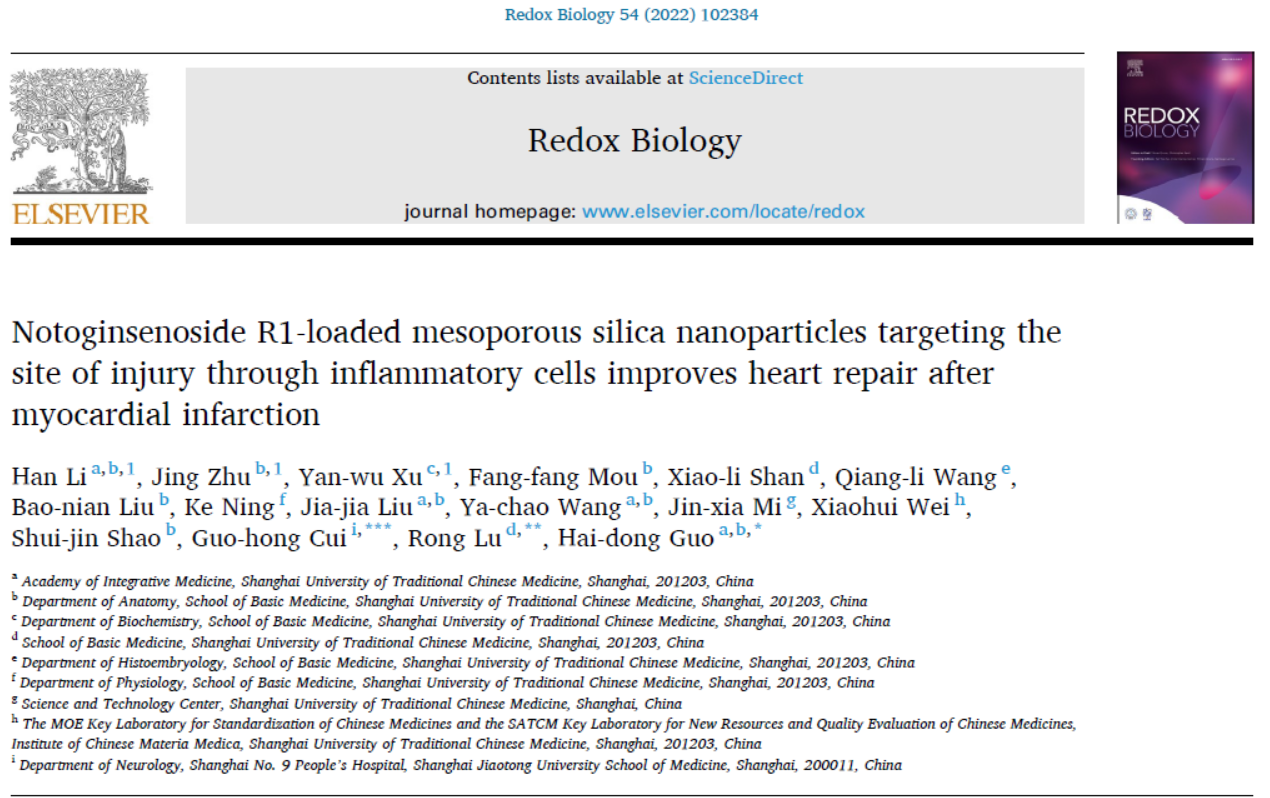 近日,嘟嘟成人网 中西医结合研究院国海东研究员和基础医学院吕嵘教授团队在三七皂苷R1(NGR1)靶向治疗心肌缺血损伤的作用及机制上取得重要进展,研究成果Notoginsenoside R1-loaded mesoporous silica nanoparticles targeting the site of injury through inflammatory cells improves heart repair after myocardial infarction发表于一区Redox Biology杂志上。