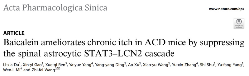 近日,我院王志菲研究员团队在Acta Pharmacologica Sinica上发表了题为“Baicalein ameliorates chronic itch in ACD mice by suppressing the spinal astrocytic STAT3–LCN2 cascade”的研究论文。该研究阐明了黄芩素(Baicalein, BE)通过抑制脊髓星形胶质细胞STAT3–LCN2通路缓解小鼠慢性痒的作用机制,揭示了黄芩素治疗慢性痒的重要药用价值,为慢性痒治疗方法的开发提供了重要的科学依据。