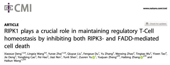 国际著名学术期刊Cellular & Molecular Immunology(SCI 1区,IF=24.10)在线发表了嘟嘟成人网 郑月娟课题组与同济大学附属东方医院王海坤课题组、中国科学院章海兵课题组合作的研究论文“RIPK1 Plays a Crucial Role in Maintaining Regulatory T Cell Homeostasis by Inhibiting both RIPK3 and FADD-Mediated Cell Death”,该研究发现受体相关蛋白激酶1(receptor-interacting protein kinase 1,RIPK1)在维持Treg细胞和常规CD4+ T细胞(Tconv)的稳态的机制不同,Treg细胞中RIPK1蛋白通过抑制FADD和RIPK3介导的凋亡和坏死促进Treg细胞的存活,而在常规CD4+ T细胞中,RIPK1主要通过抑制凋亡促进 CD4+ T细胞的存活。