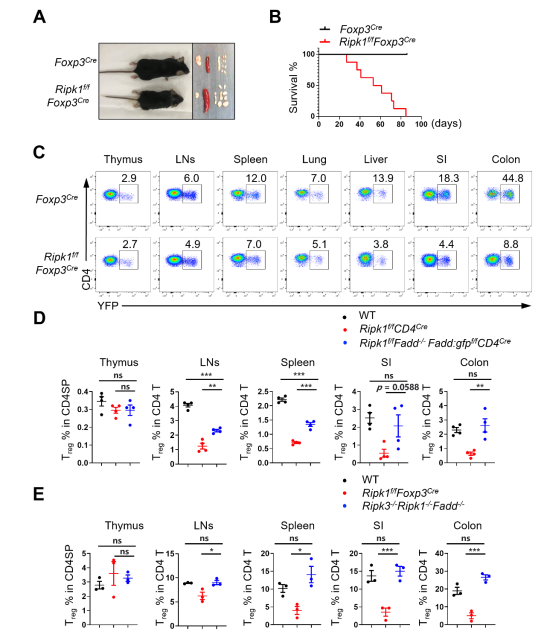 TCR信号和IL-2细胞因子信号是维持Treg细胞稳态中的关键信号,研究团队发现RIPK1的表达主要受 TCR信号调控,TCR激活可显著上调RIPK1的表达,而RIPK1的表达不受IL-2信号调控。利用Treg细胞中特异敲除RIPK1的小鼠发现,缺失RIPK1的Treg细胞虽能在胸腺中正常发育成熟,并拥有正常的增殖能力,但在外周容易发生过度的细胞死亡,导致小鼠出现严重的致死性自身免疫性疾病。利用T细胞中同时敲除RIPK1和FADD,发现大部分常规CD4+ T细胞(Tconv)可以被挽救,而Treg细胞只能被部分挽救。进一步同时敲除RIPK1,FADD和RIPK3后,Treg细胞死亡可被完全挽救(Fig. 1)。通过系列的小鼠模型的建立和分析,该研究阐明了Treg细胞中RIPK1通过同时抑制凋亡和坏死,从而调控Treg细胞的稳态。该研究成果不仅加深了对T细胞稳态分子机制的认识,同时为靶向Treg细胞治疗炎症、自身免疫病、肿瘤提供了潜在重要靶标。