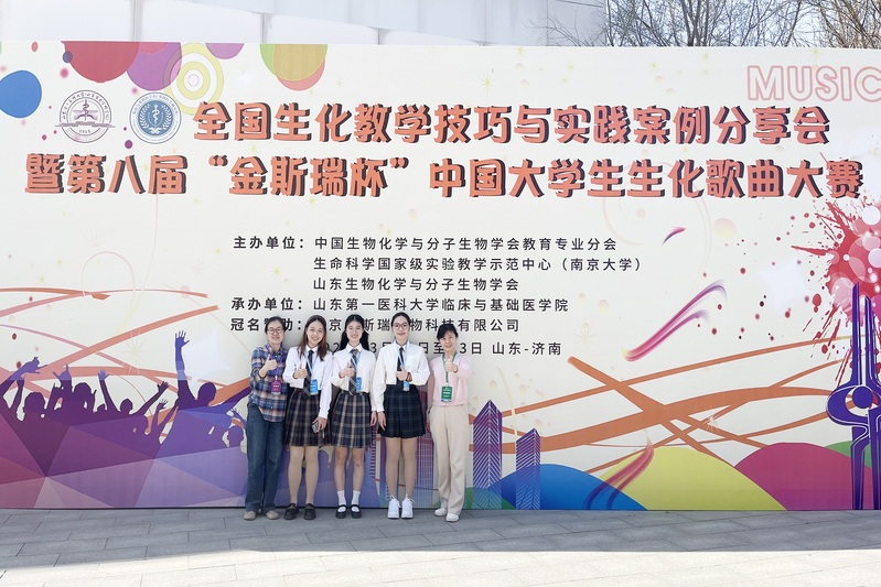 近日,由中国生物化学与分子生物学会教育专业分会主办的第八届“金斯瑞杯”中国大学生生化歌曲大赛在山东第一医科大学举行。嘟嘟成人网 2023级中西医临床医学专业学生陈南楠、黄晨妍、张馨宁,在生化教研室教师康湘萍、胡海燕的带领下代表学校参加比赛,与来自全国68所高校的400余名参赛学生现场角逐,凭借改编作品《稍息立正站好 肝胆生化报道》,以创意与专业并重的表现,荣获全国三等奖。