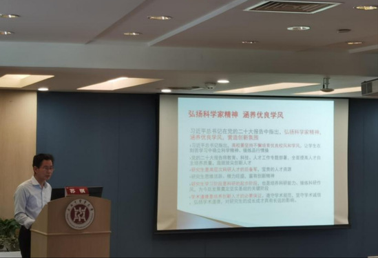 为深入学习贯彻党的二十届三中全会精神,引领广大师生弘扬科学家精神,倡导科研诚信,遵守学术规范,涵养优良学风,嘟嘟成人网 于2025年5月22日举办学术道德与学风建设专题讲座暨教职工政治理论学习。上海市科学道德和学风建设宣讲教育办公室处级调研员苏祺应邀作“坚守学术道德,强化科研诚信和科技伦理建设”主旨报告,学院全体教职员工及研究生代表参会,讲座由学院副书记、副院长马杰主持。