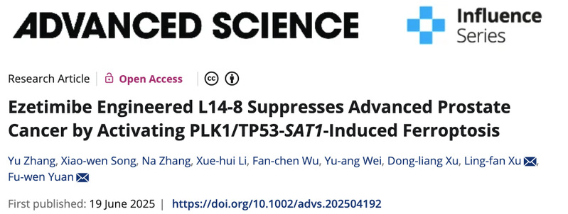 近日,我院袁富文研究员团队联合交叉科学研究院张宇、安徽医科大学第一附属医院徐凌凡在Advanced Science发表题为“Ezetimibe Engineered L14-8 Suppresses Advanced Prostate Cancer by Activating PLK1/TP53-SAT1-Induced Ferroptosis”的研究成果。该研究基于降脂药依折麦布(Ezetimibe)开发出一种可高效抑制耐药性前列腺癌的新型小分子化合物L14-8。该药物通过激活铁死亡(ferroptosis)通路杀死癌细胞,且在动物实验中未显示明显毒性,为晚期前列腺癌患者提供了独立于雄激素受体(AR)信号通路的新治疗策略。
