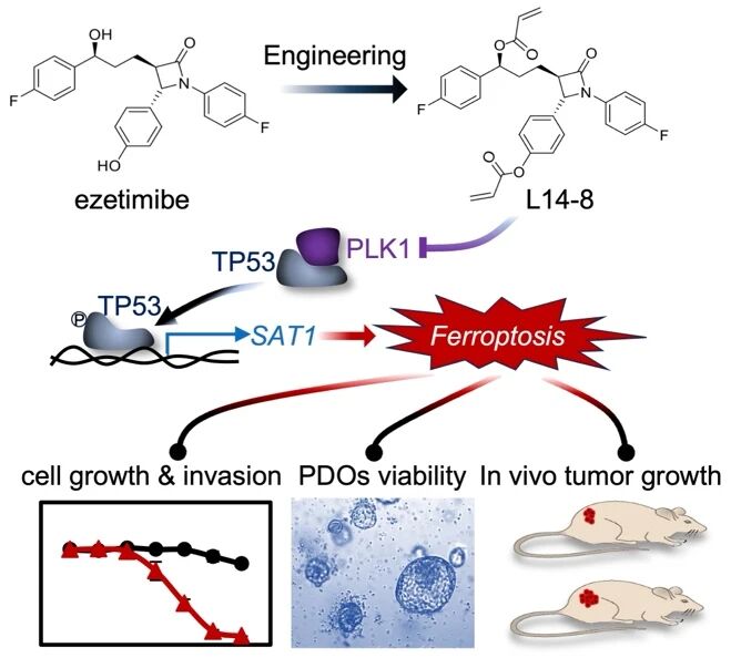 研究团队通过光化学合成技术快速构建包含461种化合物的分子库,并从中筛选出降脂药依折麦布的衍生物L14。经结构优化后获得活性更强的L14-8L14-8在耐药性前列腺癌细胞模型中IC₅₀<10 μM25 μM剂量下癌细胞死亡率超80%,但对正常前列腺细胞无显著毒性,在患者来源的类器官模型中,L14-8的抑瘤效果显著优于现有药物恩杂鲁胺。L14-8结合并降解关键蛋白PLK1,激活TP53磷酸化,进而促进铁死亡诱导因子SAT1的转录,通过SAT1触发脂质过氧化,最终诱导癌细胞铁死亡。L14-8与低剂量ARSI药物联用可显著增强抑瘤效果,有望解决临床耐药问题。小鼠模型中,L14-8治疗显著抑制肿瘤生长,且心、肝、肾等主要器官未出现明显损伤。该研究不仅提供了新型候选药物L14-8,更揭示了PLK1-TP53-SAT1轴作为前列腺癌治疗新靶点的潜力。尤其对AR信号失活的NEPC患者,L14-8有望成为潜在的有效靶向治疗方案。