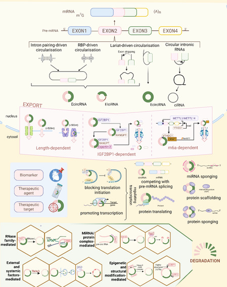该综述梳理了环状RNA的完整生命周期,包括其通过反向剪接机制实现的生成过程和依赖核酸内切酶等因素的降解途径。同时,综述阐述了环状RNA的各类功能模式,包括作为微小RNA 海绵miRNA sponge)、与蛋白质互相作用从而调控蛋白活性与定位、翻译多肽、参与DNA/RNA相互作用,以及通过胞外分泌参与细胞间通讯等,这些功能为其调控细胞生理与病理过程提供了分子基础。
