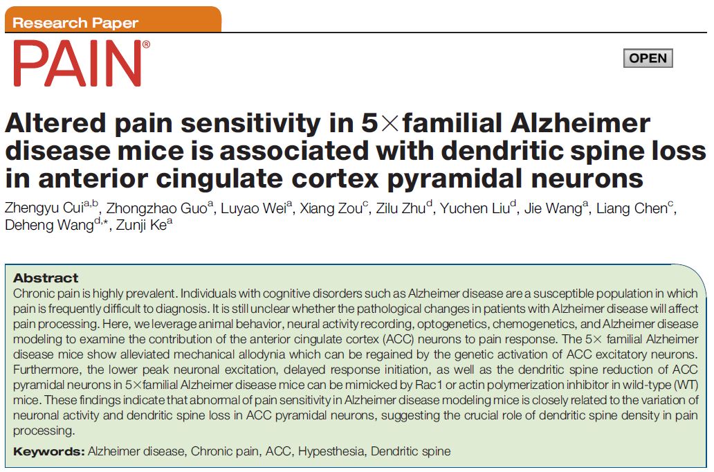 近日,疼痛学领域的专业顶级期刊《PAIN》以封面Research Paper形式发表了嘟嘟成人网 中西医结合研究院柯尊记教授与基础医学院王德恒副研究员团队的最新研究成果“Altered pain sensitivity in 5×familial Alzheimer disease mice is associated with the dendritic spine loss in anterior cingulate cortex pyramidal neurons”。论文揭示了阿尔茨海默病(AD)病人痛敏改变的神经机制。AD的病理改变会导致前扣带回脑区(ACC)内的神经元结构发生变化,并引发炎症性痛敏反应的改变。