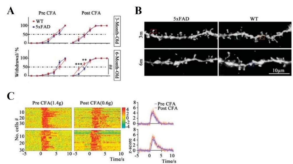 1 A)炎症状态下,6月龄5×FAD鼠的痛阈高于对照组;(B6月龄5×FADACC锥体神经元的树突棘密度低于对照组;(C6月龄5×FAD组(上方)ACC锥体神经元活性低于对照组(下方)。