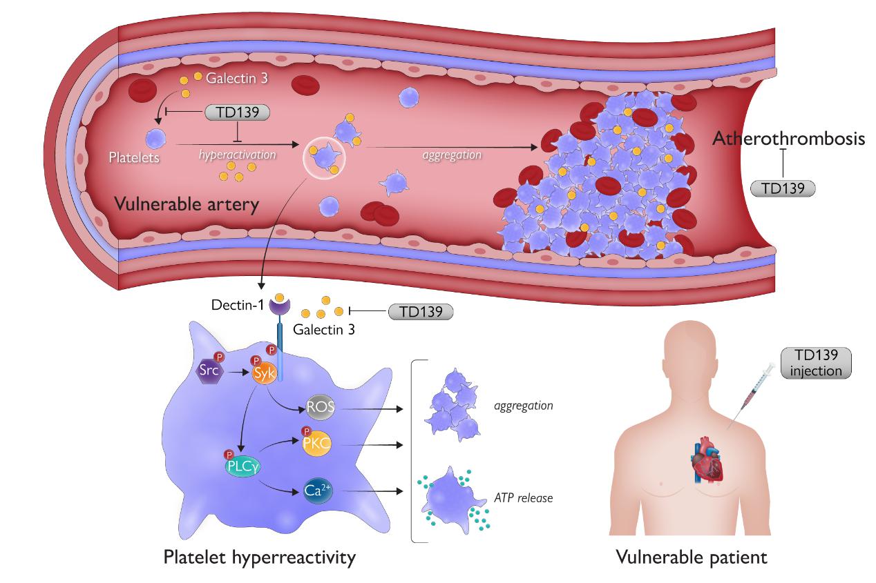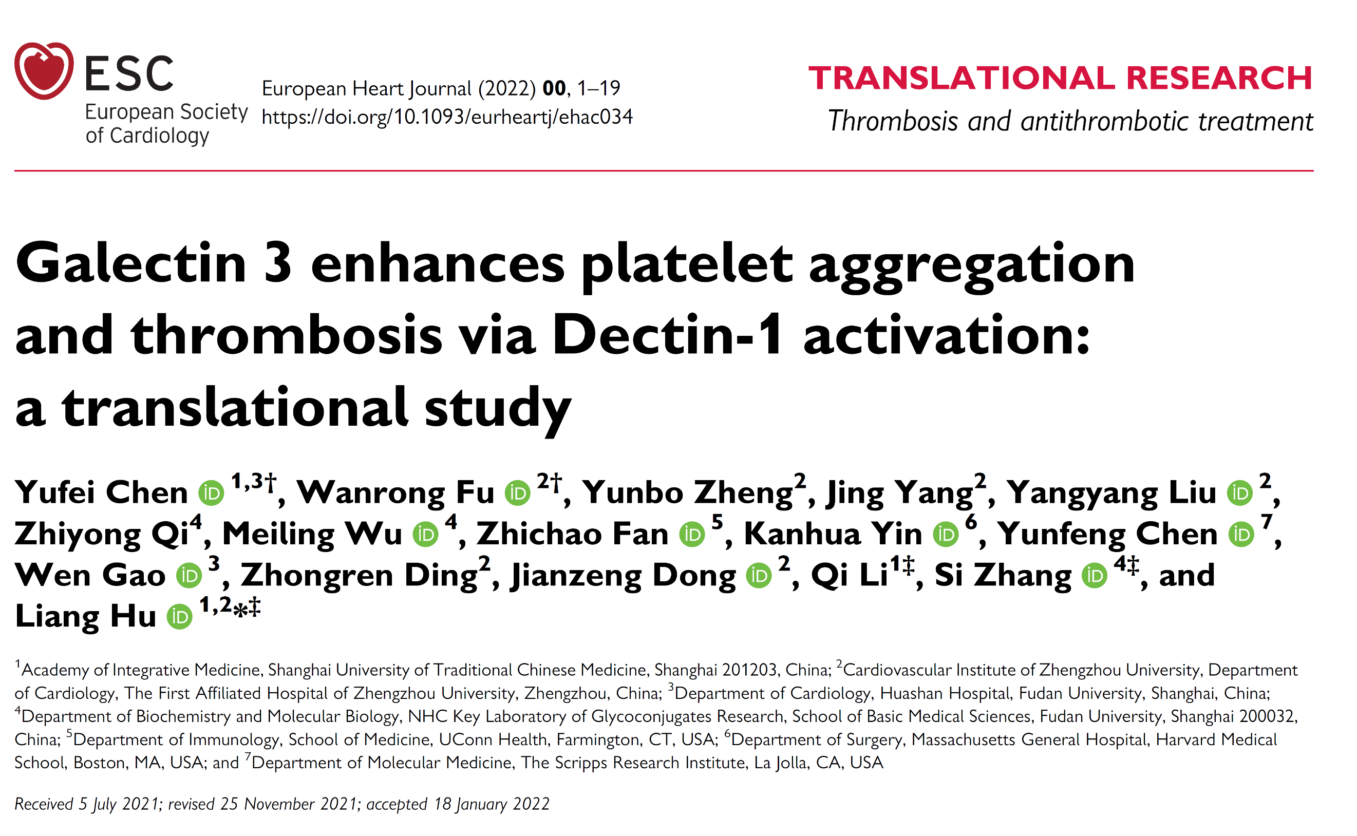 近日,欧洲心脏协会会刊European Heart Journal(IF=29.983)以Research Article在线发表了嘟嘟成人网 中西医结合研究院胡亮团队最新研究成果-“Galectin 3 enhances platelet aggregation and thrombosis via Dectin-1 activation: a translational study”,首次提出: (1)Galectin-3结合血小板膜表面的C型凝集素Dectin-1受体,促进血小板聚集和血栓形成。(2)TD139作为一种II期临床试验中应用的Galectin-3抑制剂,能抑制Galectin-3介导的血小板活化和血栓形成,且不加剧出血风险。(3)靶向Galectin-3可能作为心血管疾病治疗的新策略。针对Galectin 3/Dectin-1信号通路,研究团队发现柑橘果胶和β-葡聚糖等多个具有优秀的抗血小板作用的天然活性产物。
