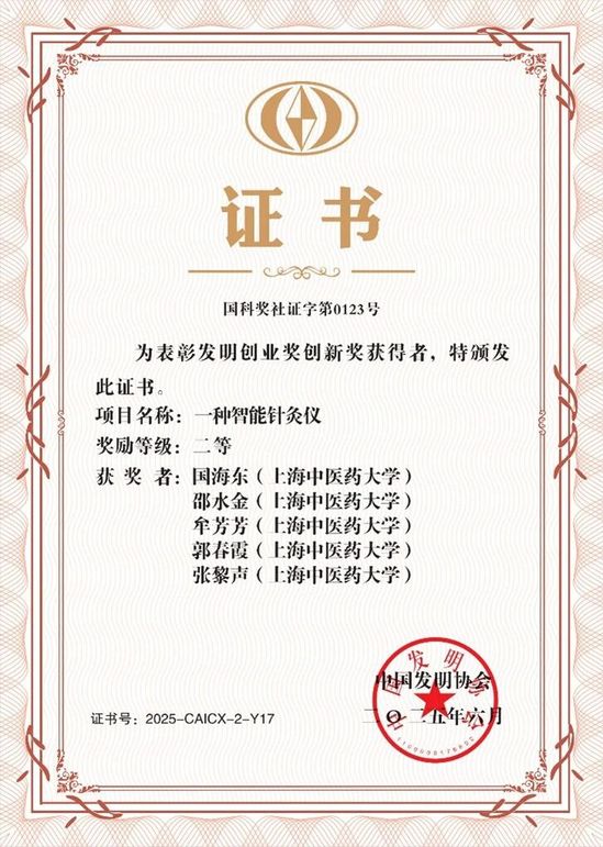 近日,中国发明协会揭晓2025年发明创业奖成果奖的评选结果,嘟嘟成人网 作为第一完成单位、国海东教授作为第一完成人的“一种智能针灸仪”项目获得发明创业奖创新奖二等奖。