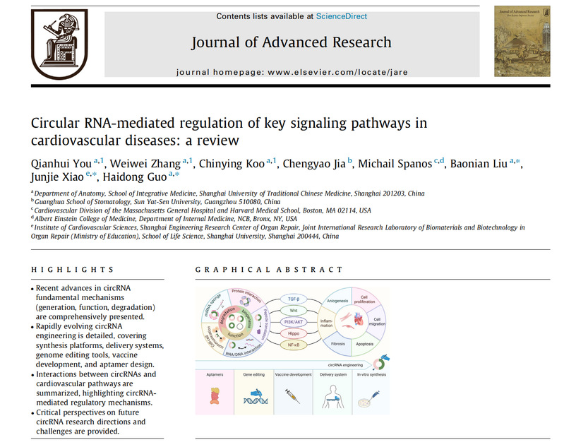 近日,嘟嘟成人网 嘟嘟成人网 国海东教授团队、刘宝年团队联合上海大学肖俊杰教授团队,在国际知名学术期刊Journal of Advanced Research发表题为“Circular RNA-mediated regulation of key signaling pathways in cardiovascular diseases: a review”的论文,总结了环状RNA的生命周期、工程学应用潜力,以及其在调控心血管疾病核心信号通路中的研究现状,为该领域研究提供参考的同时,也针对当前心血管疾病治疗面临的分子机制瓶颈,探讨了基于环状RNA的未来探索方向。